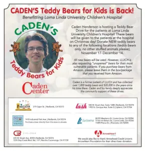 Give a child the gift of a teddy bear on Christmas morning with Caden’s Teddy Bear Drive benefiting Loma Linda University Children’s Hospital. Donate New teddy bears to any of the following locations below. (Teddy Bears only, no other stuffed animals). Please drop off between Nov 17th-Dec 14th