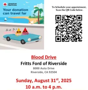 Our friends at Fritts Ford in Riverside are having a big blood drive with the American Red Cross on Sunday, August 31st from 10:00 A.M–4:00  P.M.  Your donation can help save lives—and every drop counts. Let’s come together as a community and make a difference.