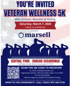 You’re invited to the Veteran Wellness 5k Miles of Honor. Moments of Healing. Kicking off Saturday March 7th at Central Park in Rancho Cucamonga, check in at 8am.